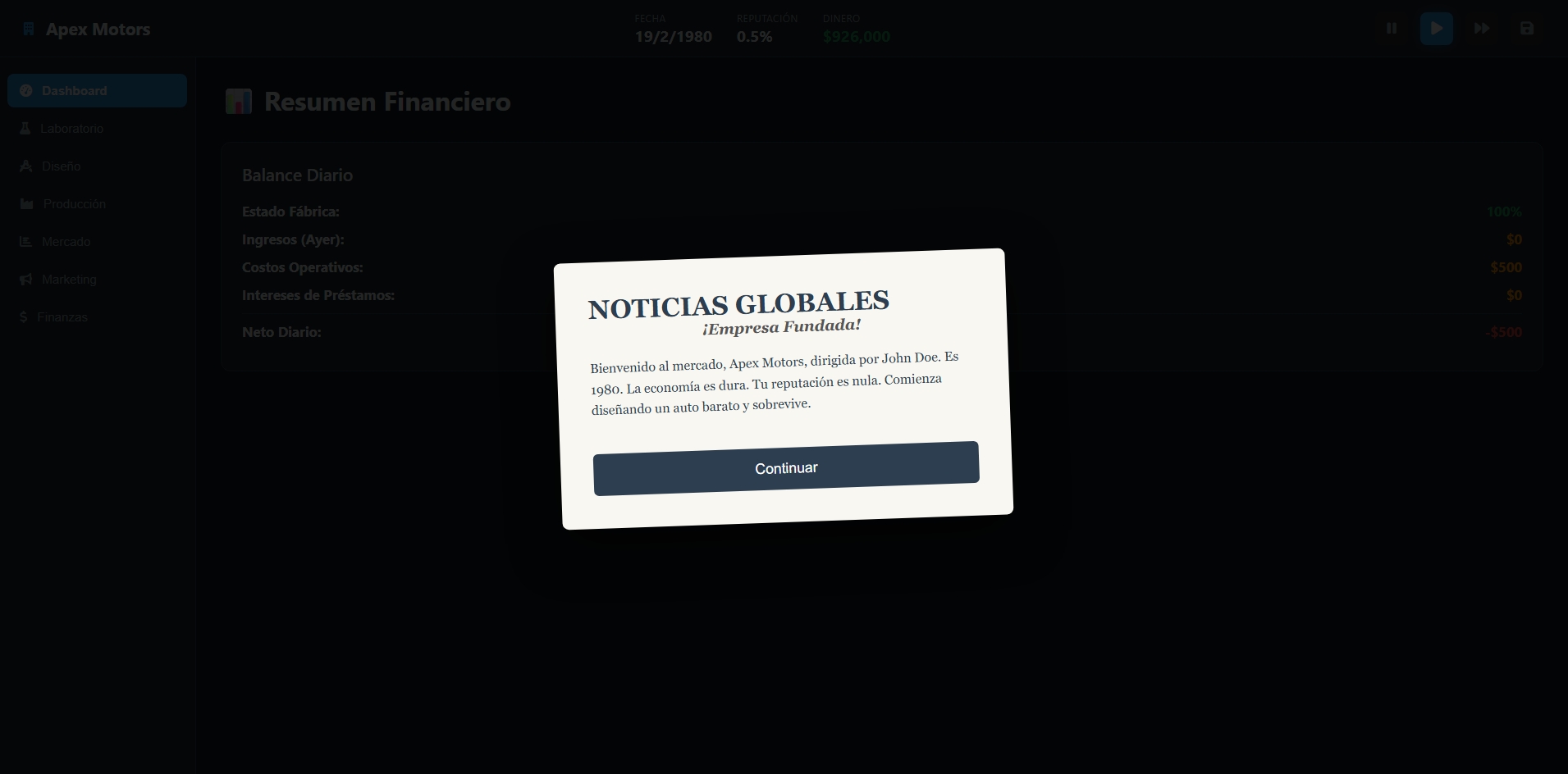 ManufactureTycoon: R&D & Real Market Edition is a challenging automotive simulation where success hinges on smart vehicle design, cutting-edge research, and strategic marketing in a volatile global market. Design your models for maximum appeal, knowing that each one has a critical lifecycle of 6 to 12 months; upon release, a crucial press review—the "Newspaper Note"—will determine your sales trajectory based on how well your vehicle's quality, installed technology, and price align with current market trends. Invest heavily in R&D and targeted campaigns to build brand hype and ensure your car models transition from design concept to market legend before their inevitable sales decline This is my first proyect